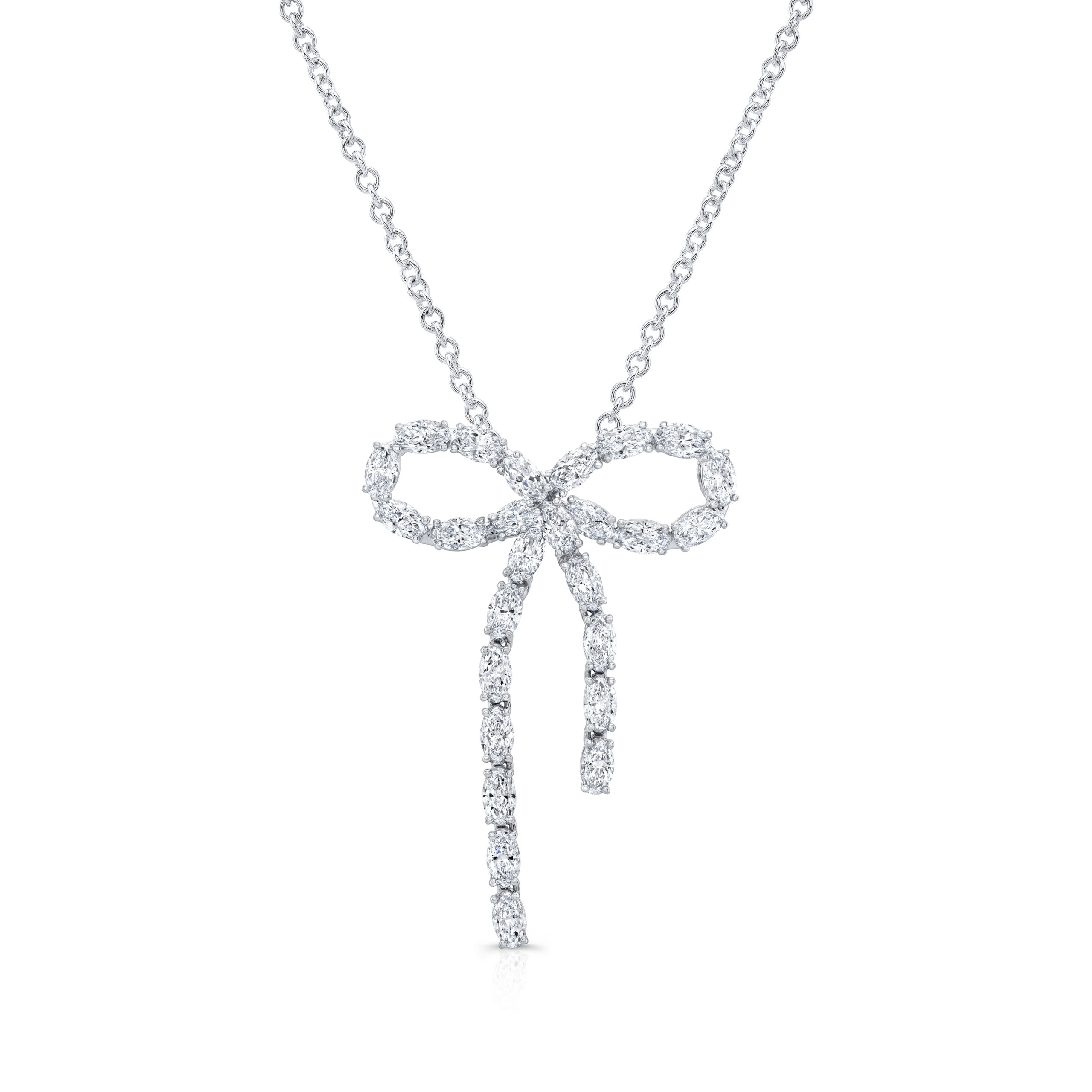 Featured here is a Rahaminov 18K White Gold Moval Diamond Bow Pendant. The total diamond weight of this stunning necklace is 5.15ct with 31 moval diamonds.