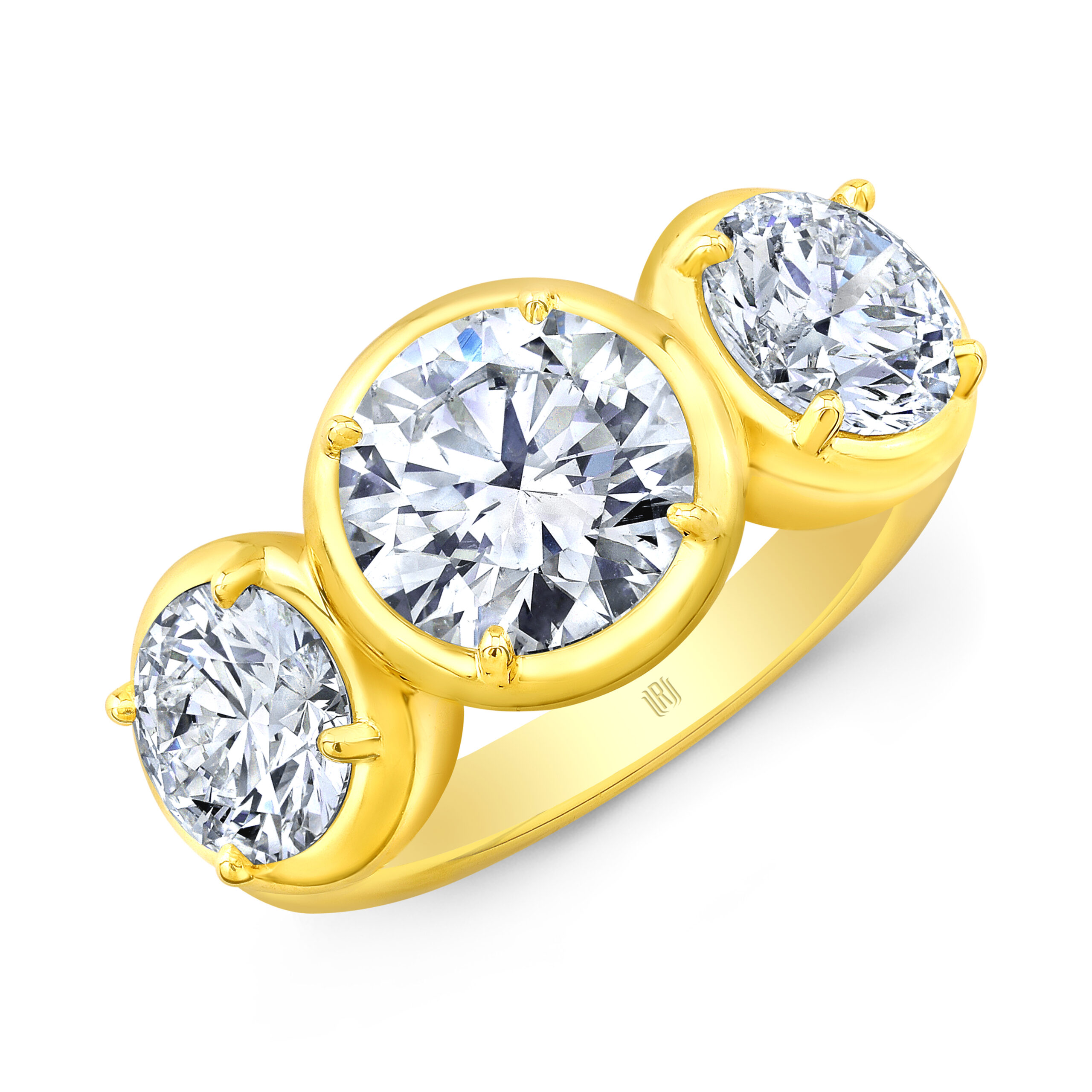 Featured is a Rahaminov 18K Yellow Gold Diamond 3 Stone Ring. Total Diamond weight of this stunning ring is 2.69ct with three round diamonds.