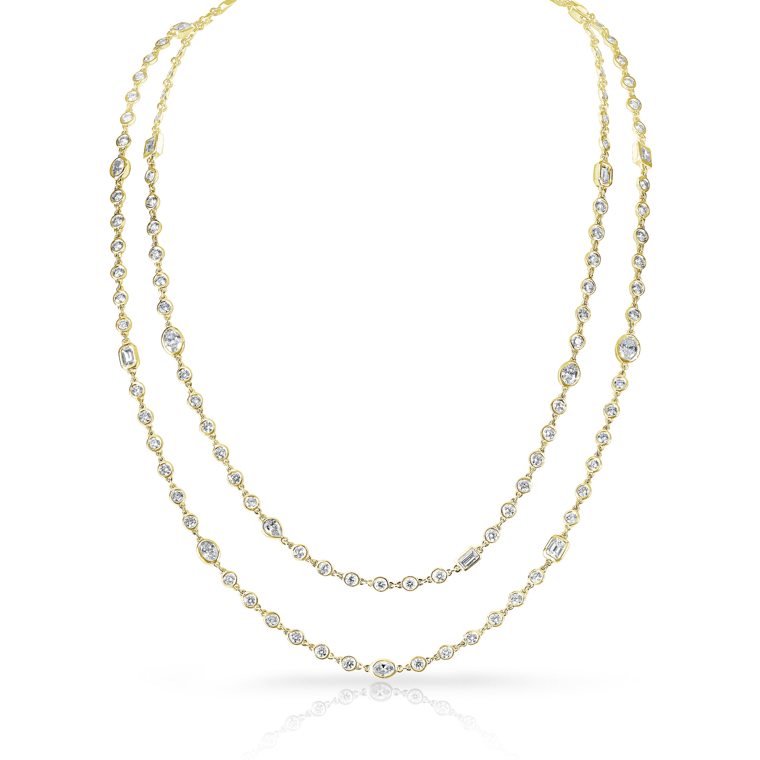 Featured is a Rahaminov 18k Yellow Gold Diamond By the Yard Necklace. The total diamond weight of this stunning necklace is 11.92ct. The necklace features 6 oval diamonds, 6 emerald cut diamonds, and 114 round diamonds. Try on and enjoy this necklace at our Yamron Jewelers Boutique located at the Waterside Shops in Naples, FL ->