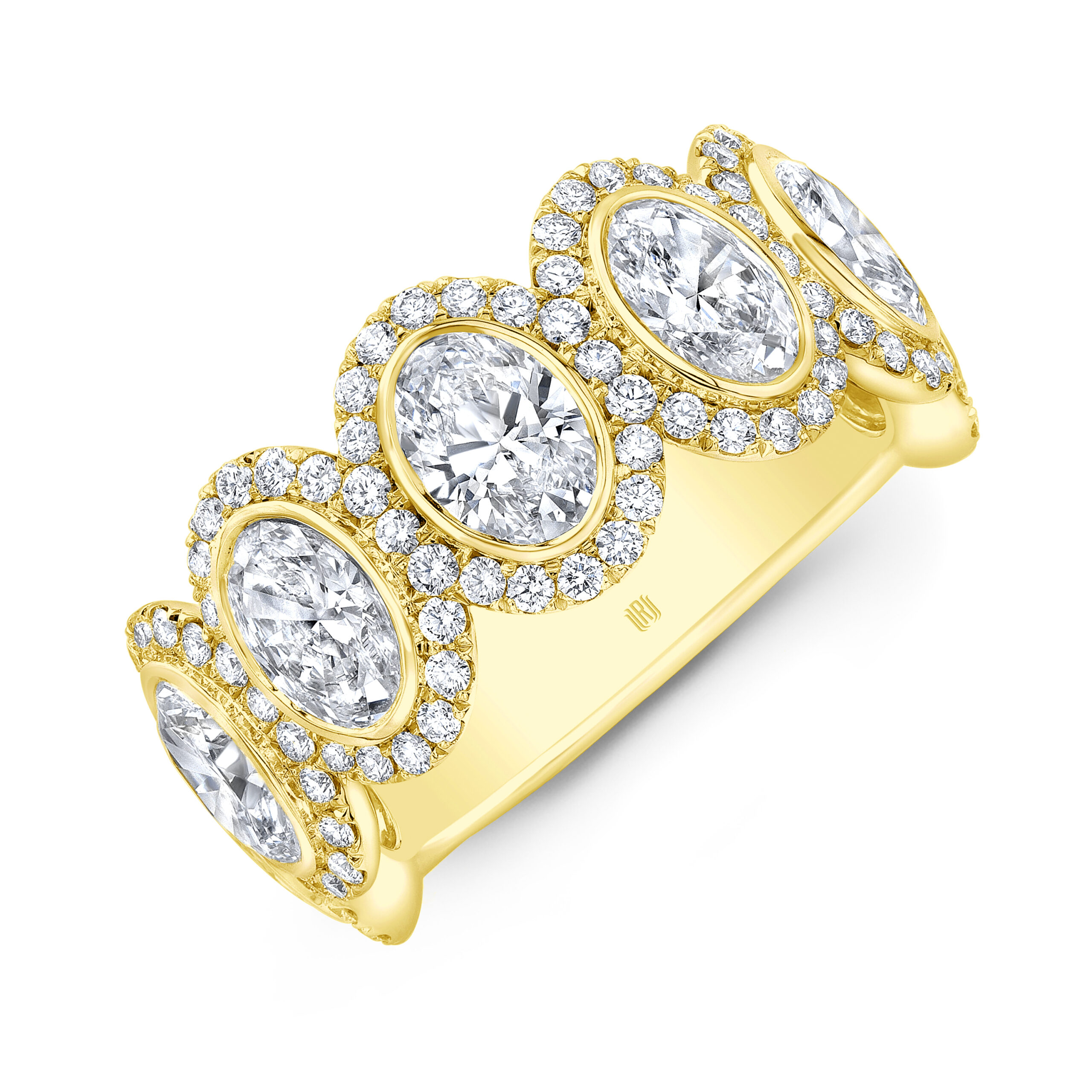 Featured is a Rahaminov 18K Yellow Gold Oval Diamond Halo Band. Total Diamond weight of this stunning ring is 3.75ct with 7 oval diamonds and 109 round diamonds.