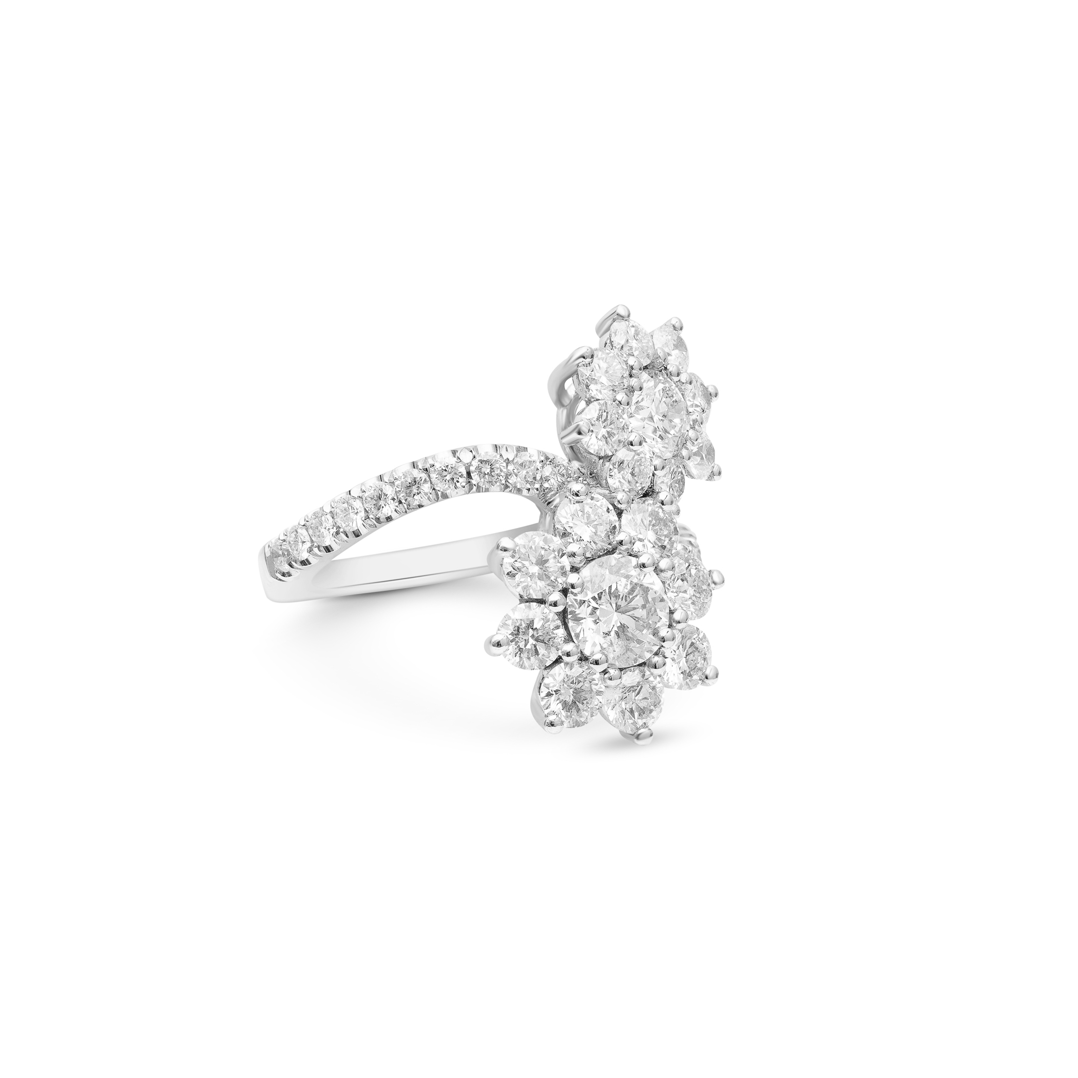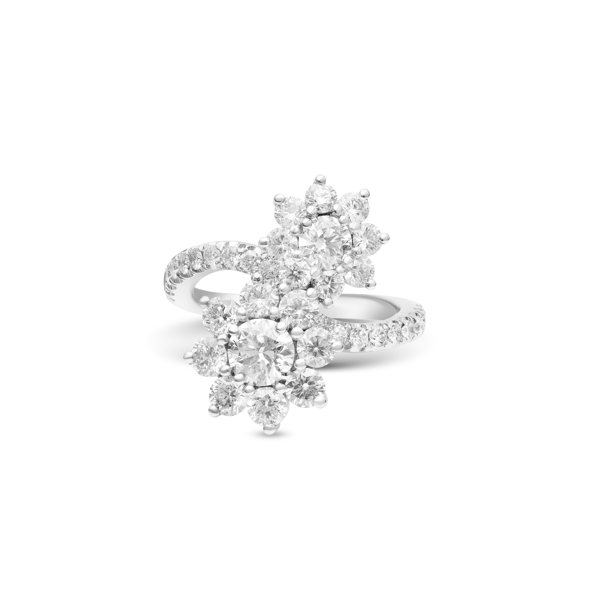 Featured here is a Yamron Collection Platinum Diamond Cluster Bypass Ring. The total diamond weight of this stunning ring is 3.40ct. The ring features 58 round diamonds.